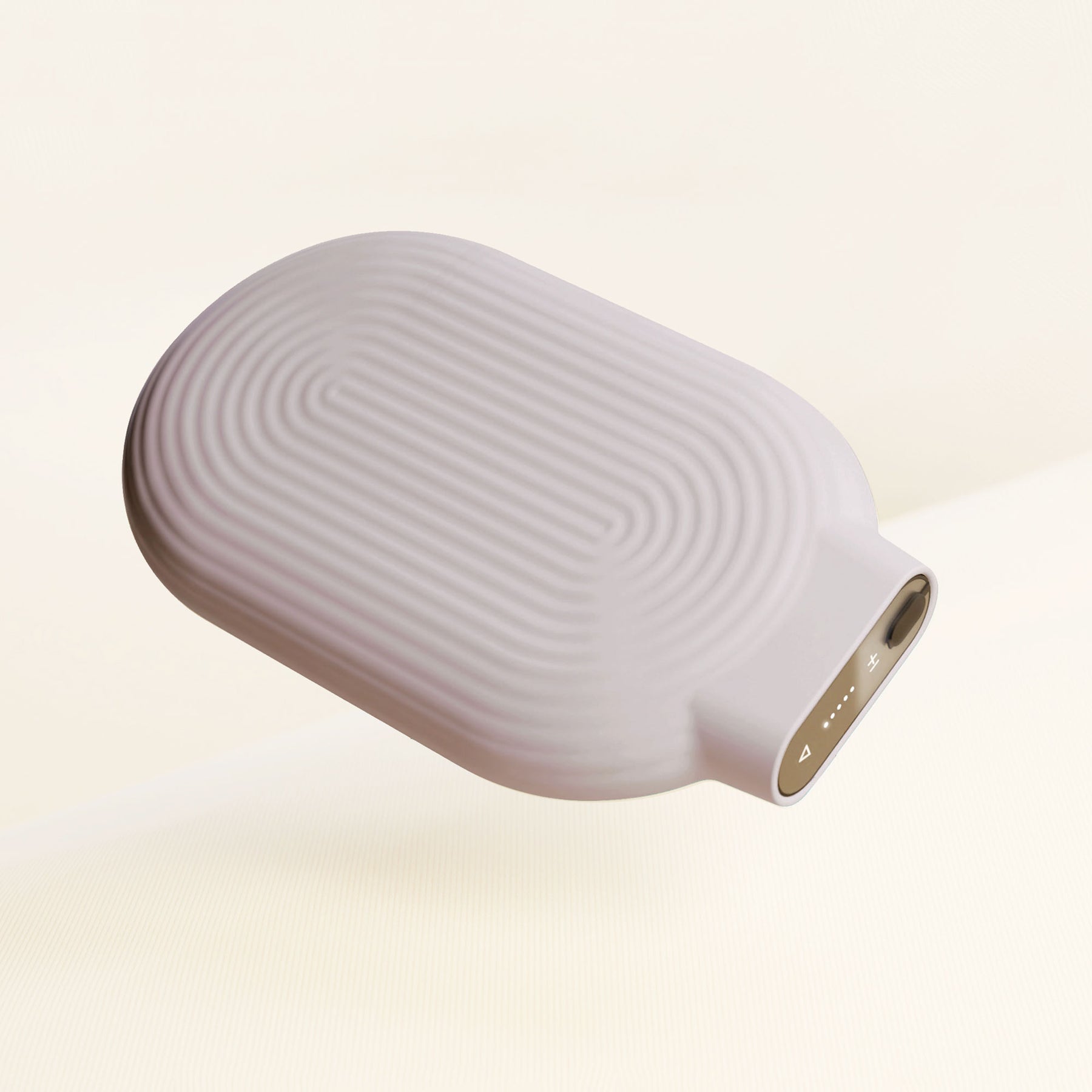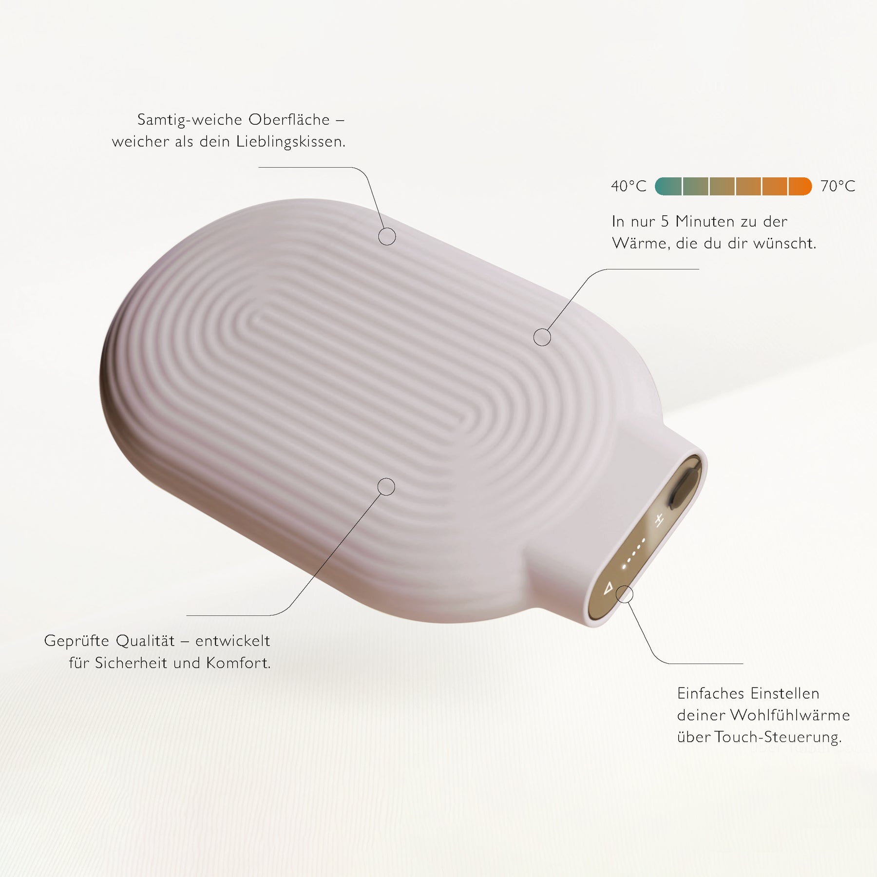Das integrierte Heizelement erwärmt ein versiegeltes Wärmefluid im Inneren der Flasche. Dieses speichert die Wärme und gibt sie gleichmäßig und langanhaltend an die Umgebung ab — für wohltuende Wärme, ganz ohne Wasser.