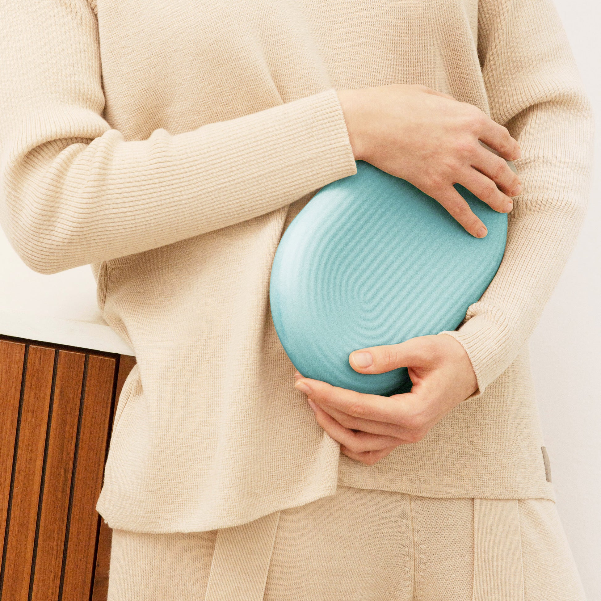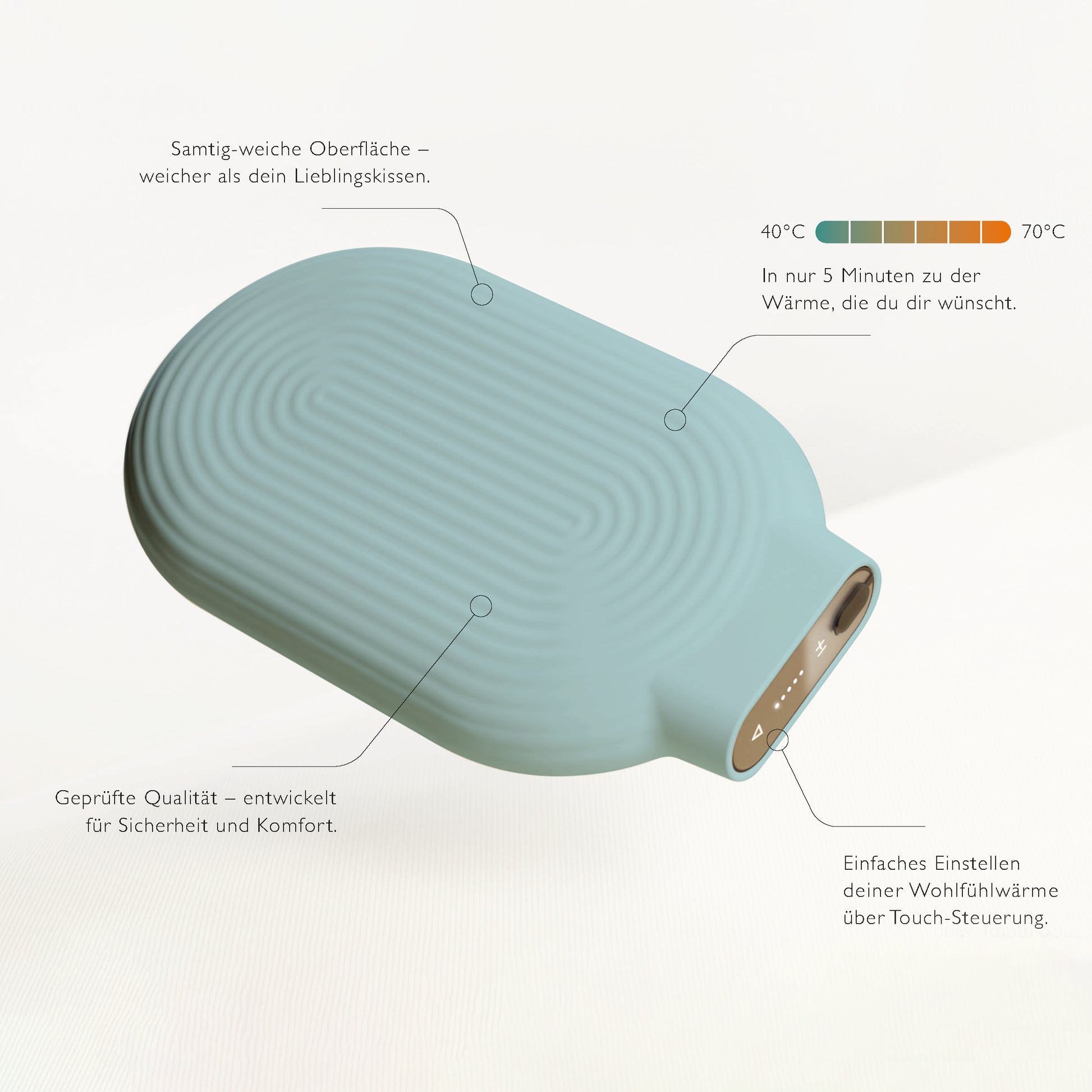 Das integrierte Heizelement erwärmt ein versiegeltes Wärmefluid im Inneren der Flasche. Dieses speichert die Wärme und gibt sie gleichmäßig und langanhaltend an die Umgebung ab — für wohltuende Wärme, ganz ohne Wasser.